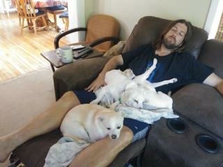 FYI – I had to look at that picture again. It just looked strange. Let me explain why. From top to bottom. Eric, next is Bart our former foster puppy, then below the sprawling puppy is our dog Casey, and at the bottom is our dog Roux. I couldn’t understand how Casey’s legs were sprawled up like that. But it wasn’t. There are three canines on Eric’s lap. Awww… what a pal!